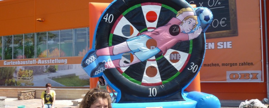 Ein echter Besuchermagnet ist unsere große Dartscheibe. Auf dieser Fläche von 4,5m x 5,0m wird nicht geworfen, sondern scharf geschossen. Eine ausgefallene und lustige Alternative zur Torwand. Hier können Ihre Gäste sich einen spannenden Wettbewerb untereinander liefern oder an einem Gewinnspiel, wofür dieses Modul auch super geeignet ist, teilnehmen. Dieses Modul ist nicht nur für Fußballbegeisterte, jedermann hat hierbei seinen Spaß. Holen Sie Sich diese Attraktion auf Ihre Veranstaltung, Ihre Gäste werden begeistern sein. Optional auch kombinierbar mit unserem Ballgeschwindigkeitsmesser.