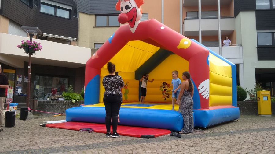 Hüpfburg für bis zu 16 Kindern gleichzeitig. Die Hüpfburg ist geeignet für Kinder im Aler von 03 - 14 Jahren. Die Hüpfburg erhalten Sie komplett mit Gebläse, Unterlegplane, Befestigungsmaterial, Fallschutz sowie einen kleinen Teppich, damit die Kinder sich die Schuhe ausziehen können. Diese Hüpfburg ist mit Dach und somit weitestgehend regenfest, bei Sonne dient das Dach perfekt als Schutz, die Luft die über das Gebläse in die Hüpfburg gelangt, sorgt für ein angenehmes Klima auch an heißen Tagen.