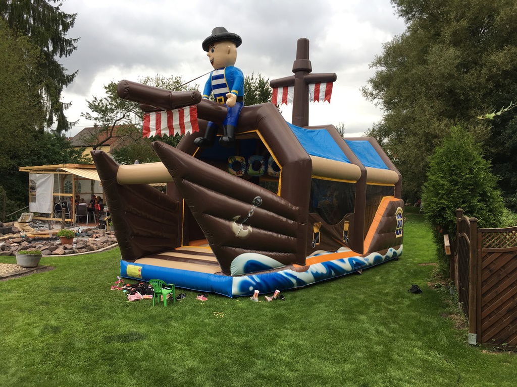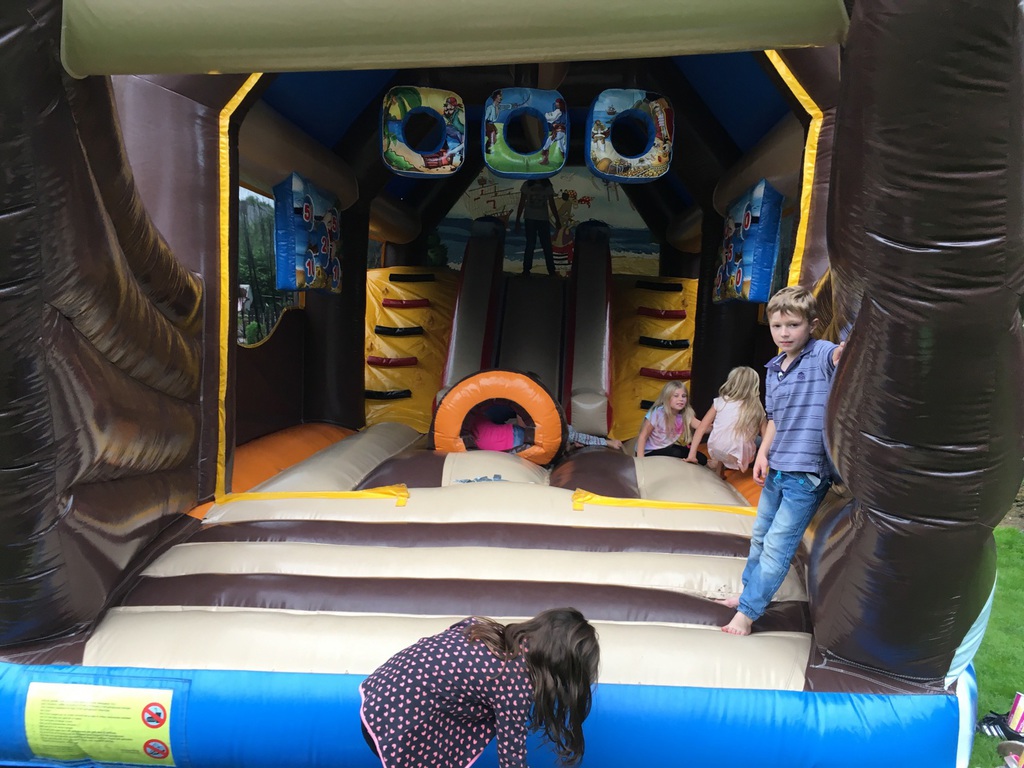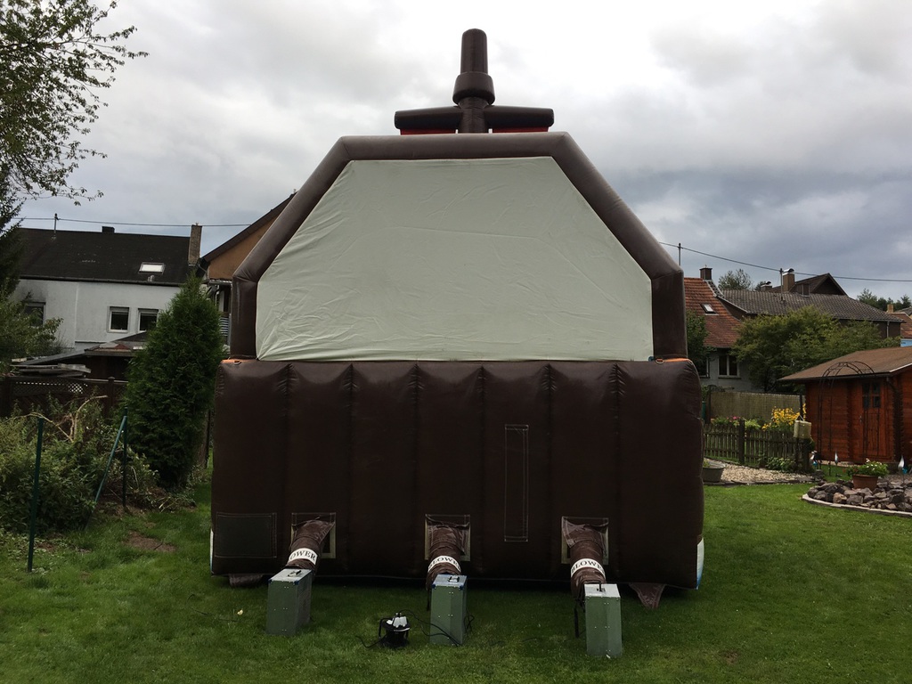 Die Hüpfburg hat eine Grundfläche von knapp 50 m². Auf dieser Fläche gibt eine Hüpffläche, zwei Kletteraufstiege, Hindernisse und eine große Rutsche. An kritischen Stellen sind extra Sicherheitsnetze angebracht, die ein mögliches Rausfallen vermeiden. Eine absolute Atraktion auf jedem Fest! Hier kommt keine Langeweile auf. Die Kinder können nach Herzenslust hüpfen, rutschen, klettern, krabbeln und Hindernisse überwinden.