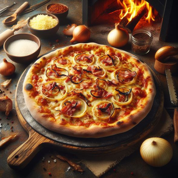 drei gasbetriebenen, hochwertigen Flammkuchenöfen das Backwerk mit Wunschzutaten zu.